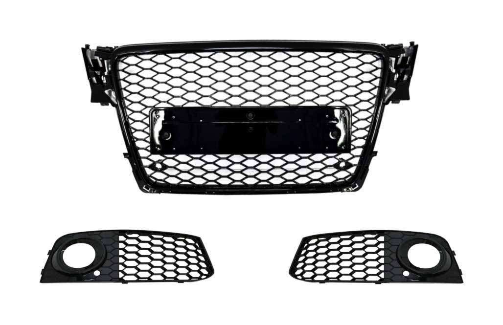 Badgeless Front Grille with Fog Lamp Covers Side Grilles suitable for Audi A4 B8 (2008-2011) RS4 Design Piano Black