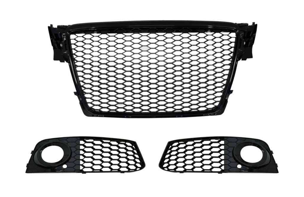 Badgeless Front Grille with Fog Lamp Covers Side Grilles suitable for Audi A4 B8 8K (2007-2012) RS Design Piano Black