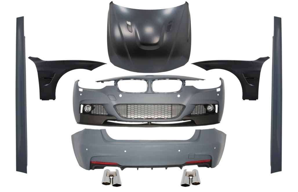Complete Body Kit suitable for BMW 3 Series F30 (2011-2019) M-Performance Design with Front Fenders Black and Hood Bonnet & Muffler Tips Chrome