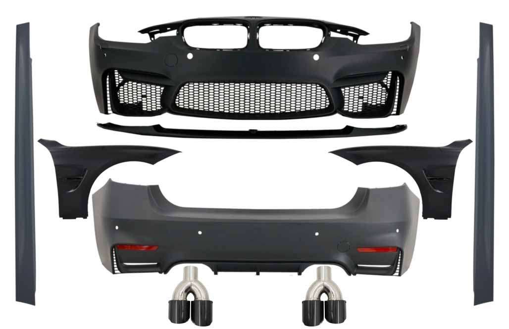 Complete Body Kit with Carbon Fiber Exhaust Muffler Tips and Front Fenders Black suitable for BMW F30 (2011-2019) EVO II M3 CS Style Without Fog Lamps