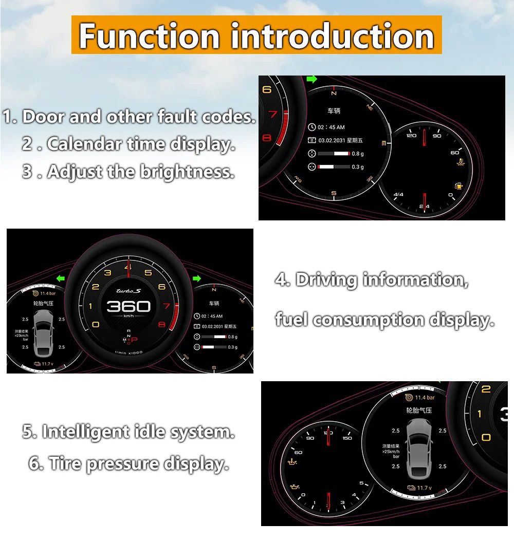 Επιπλέον, παρέχει πληροφορίες σχετικά με το όχημα και πιθανά προβλήματα (π.χ. cruise control, οδόμετρο και ταχύτητα, πίεση ελαστικών, κατανάλωση καυσίμων, θερμοκρασία, λάθη κινητήρα κλπ.).