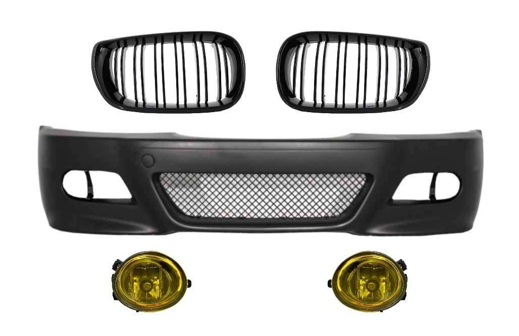 Front Bumper with Fog lights suitable for BMW 3 Series E46 (1998-2004) M3 Look and Central Kidney Grilles Double Stripe M Design Piano Black